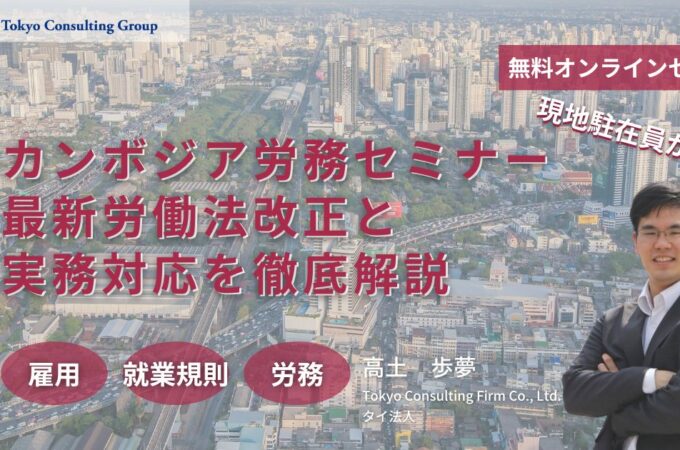 【2月19日】【Webセミナー】カンボジア労務セミナー:最新...セミナー概要 カンボジアの複雑な労働法規を徹底解説。 現地進出企業の労務リスクを最小限に抑える実践的な知識を提供し、トラブル回避を...Web開催セミナー, 海外進出, 人事労務セミナー, 参加受付中