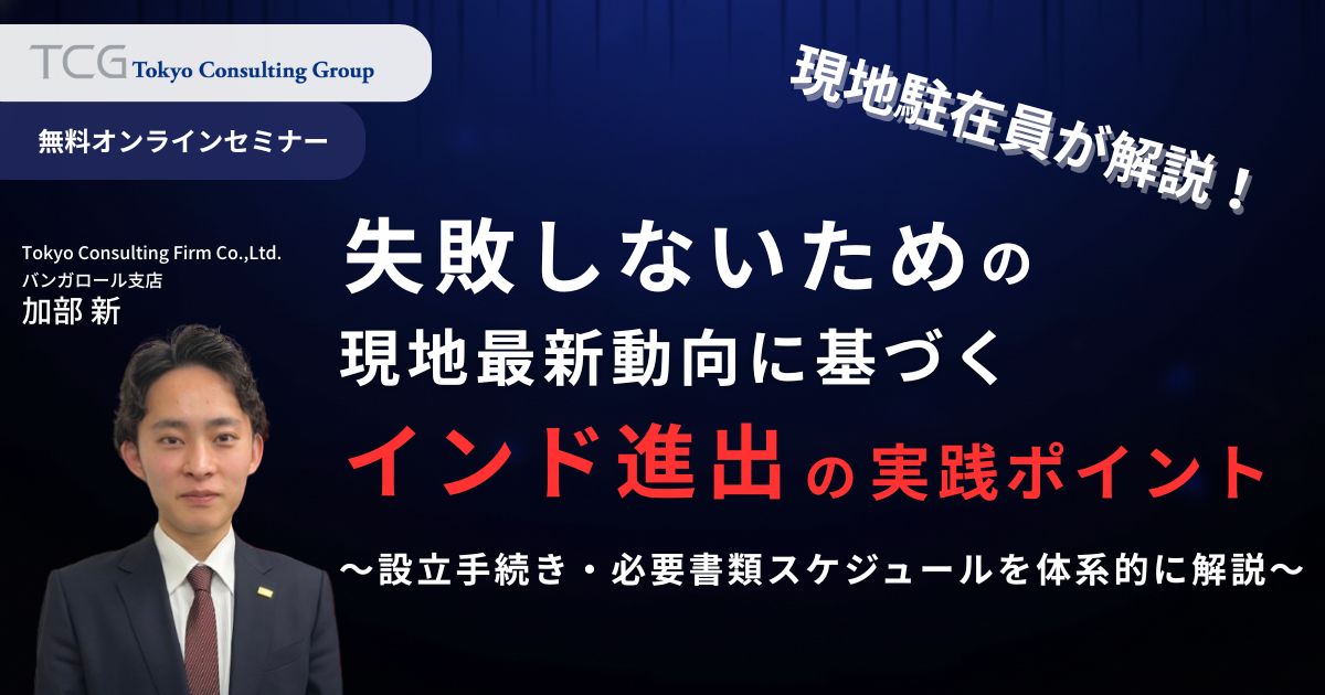 本セミナーでは、インド会社設立の全体像を実務の流れとして整理し、検討段階で必要となる背景知識(法人形態の違い、出資・ガバナンスの考え方、設立時に論点になりやすい事項)を含めて、分かりやすく解説します。